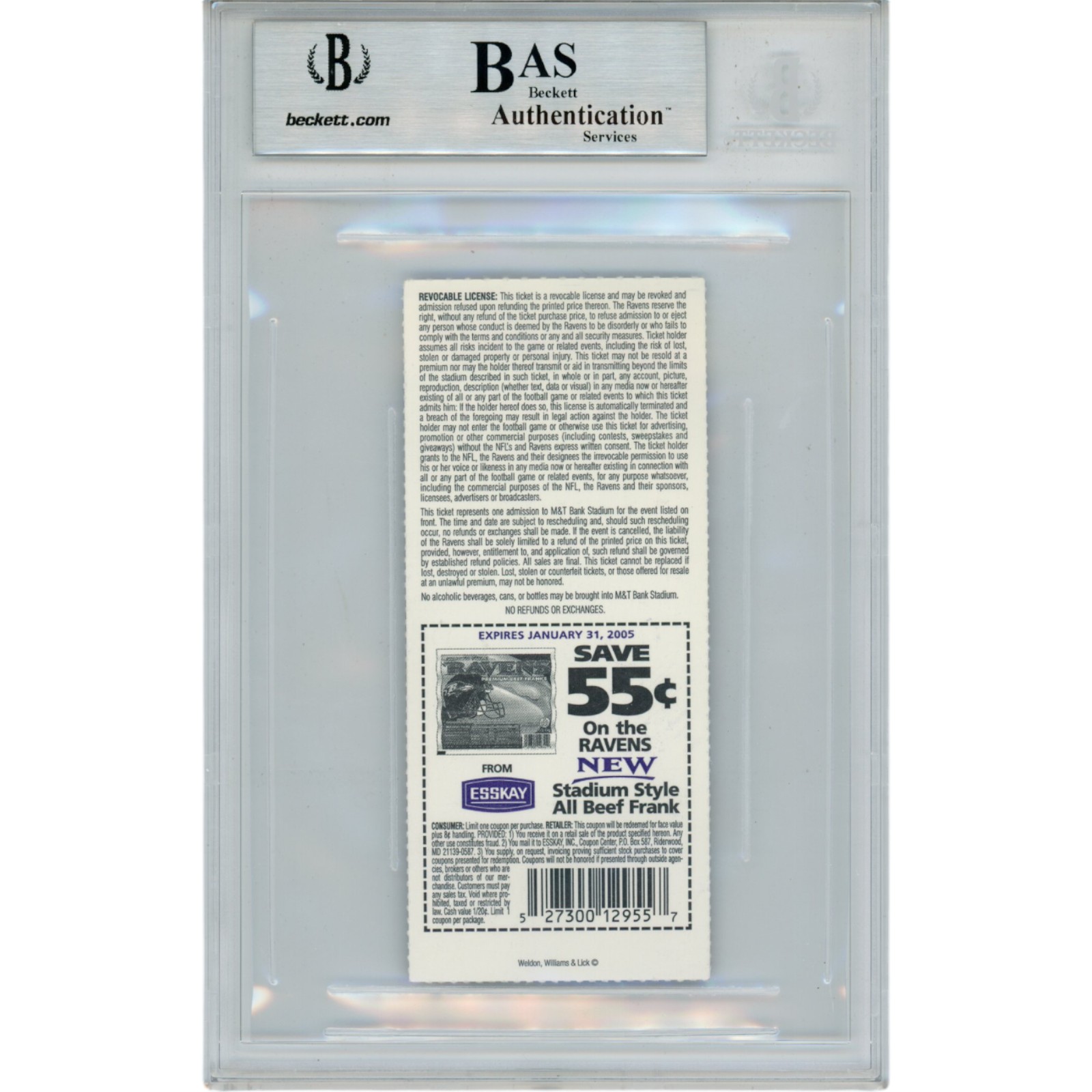 This is a Baltimore Ravens Slabbed 12/12/2004 Ticket Stub that was personally autographed by Ray Lewis. Includes a certificate of authenticity from Beckett Authentication Services (BAS) and Denver Autographs.