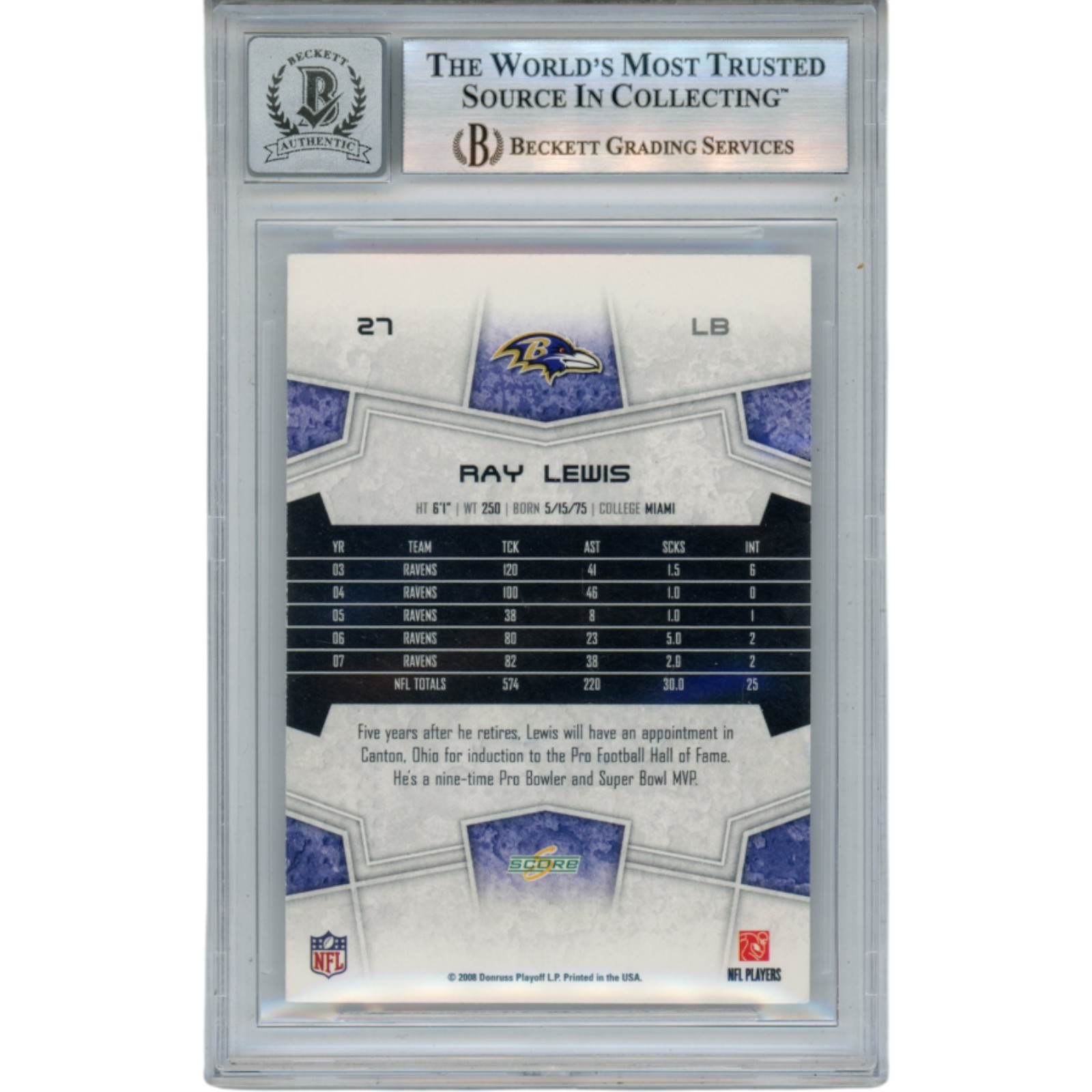 The number in the listing title is just an inventory sku for our records and is not the authentication number. The item pictured is the exact item you will receive, please see photos for condition. This is a Baltimore Ravens 2008 Score #27 Slabbed Trading Card that was personally autographed by Ray Lewis. Includes a certificate of authenticity / hologram from Beckett Authentication Services (BAS) and Denver Autographs. FREE SHIPPING within the USA on orders over $99!