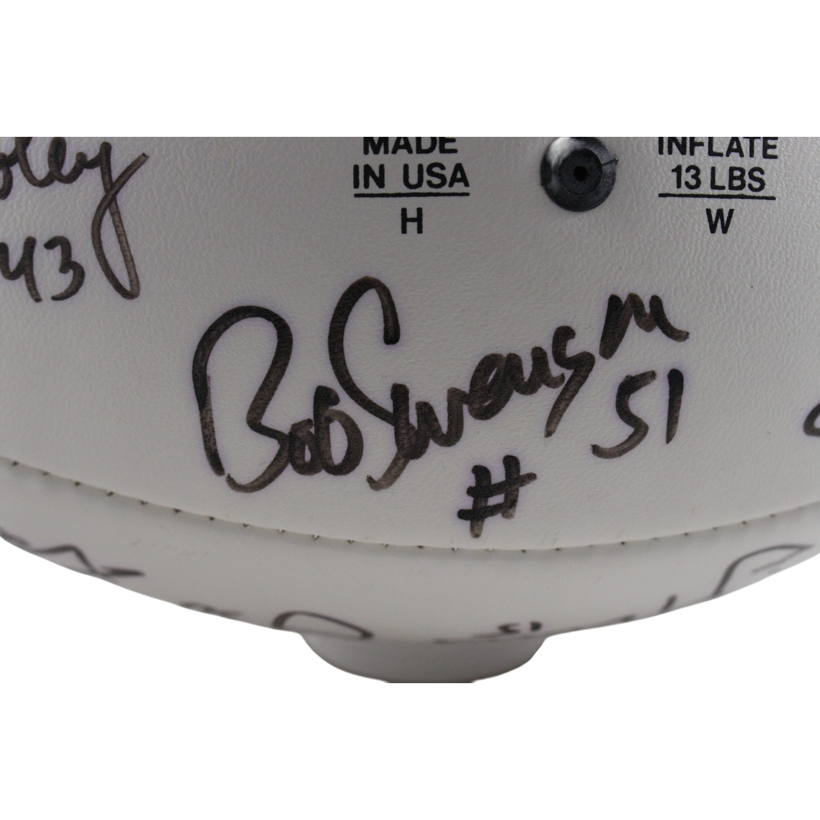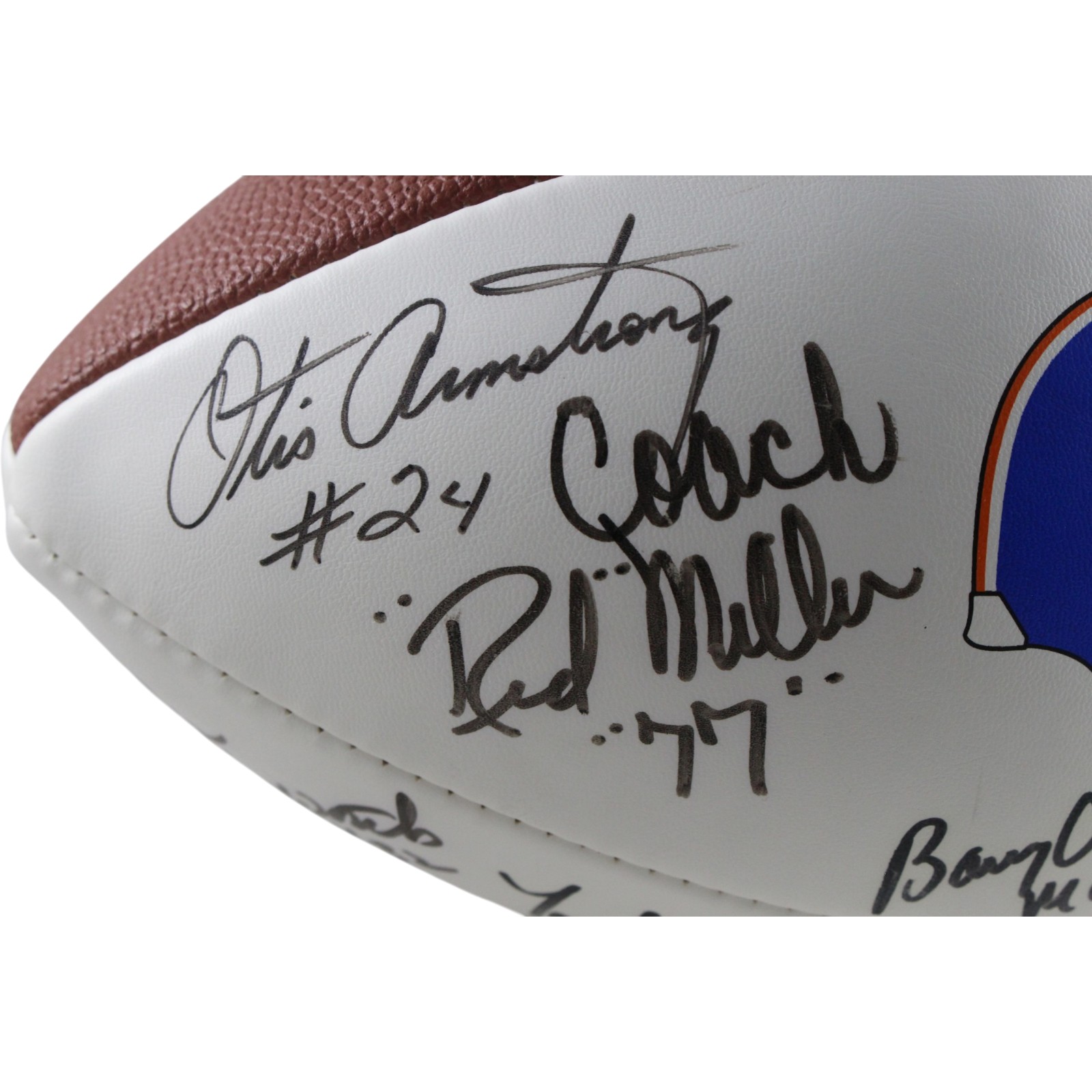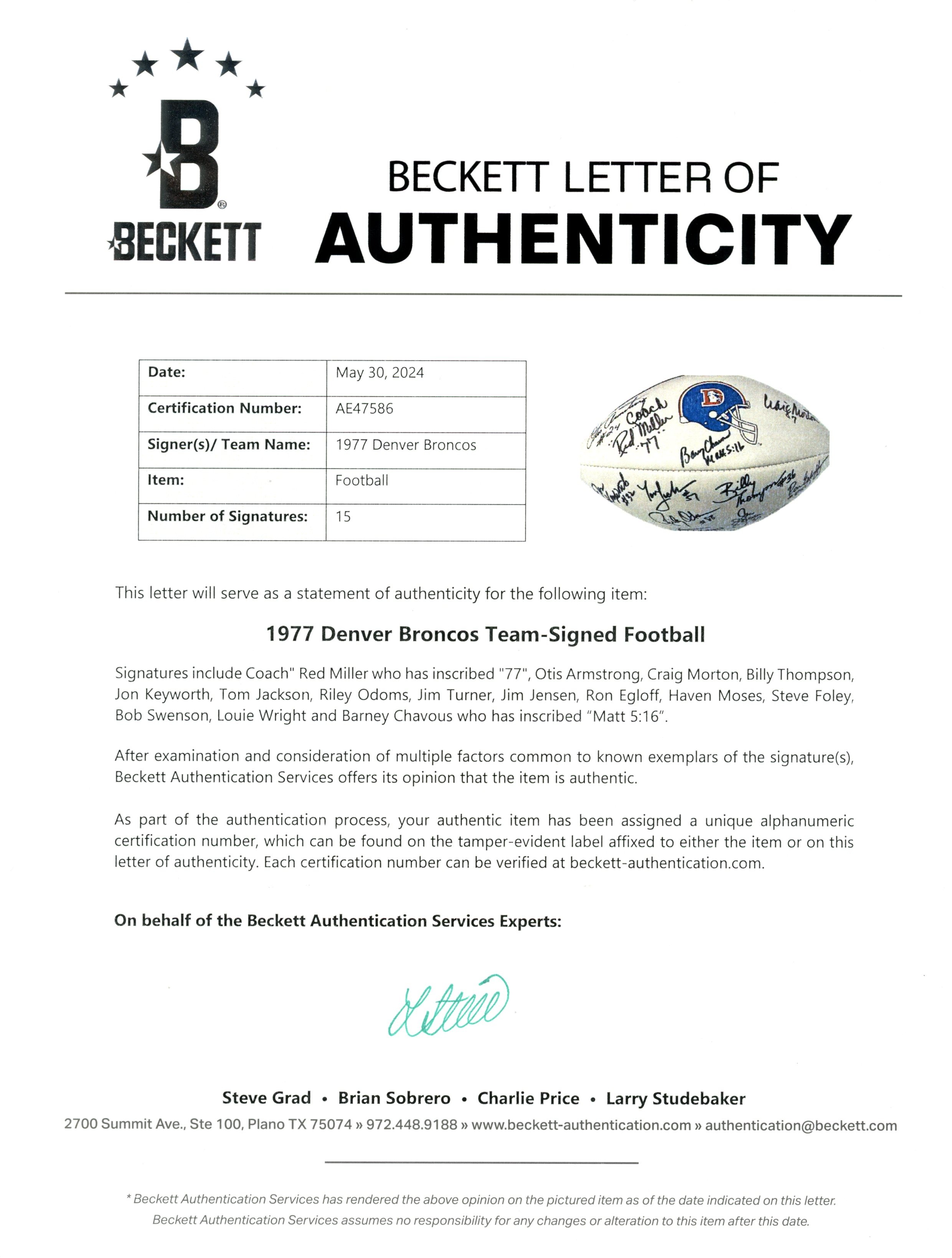 The number in the listing title is just an inventory sku for our records and is not the authentication number. The item pictured is the exact item you will receive, please see photos for condition. This is a Denver Broncos 1977 Team Multi-Signed 15 Total Signatures Football that was personally autographed by Coach Red Miller (“77), Otis Armstrong, Craig Morton, Billy Thompson, Jon Keyworth, Tom Jackson, Riley Odoms, Jim Turner, Jim Jensen, Ron Egloff, Haven Moses, Steve Foley, Bob Swenson, Louie Wright, and Barney Chavous (Matt 5:16). Please note that this ball does not hold air and is being sold AS IS. Includes a certificate of authenticity / hologram from Beckett Authentication Services (BAS) and Denver Autographs. FREE SHIPPING within the USA on orders over $99!