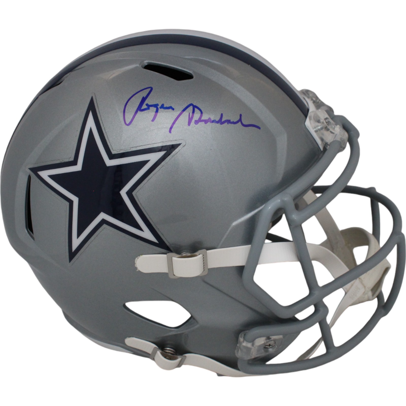 This is a Dallas Cowboys Full Size Replica Helmet that was personally autographed by Roger Staubach. Includes a certificate of authenticity from Beckett Authentication Services (BAS) and Denver Autographs.