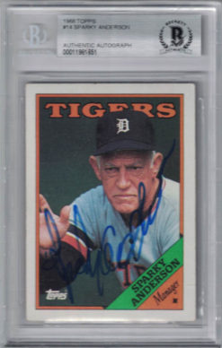 This is a Detroit Tigers 1988 Topps #14 trading card that was personally autographed by Sparky Anderson. This is the exact item that you will receive so please see scans for condition. Card has been slabbed by Beckett Authentication Services (BAS) and Denver Autographs.